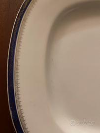 Elegante piatto da portata rettangolare vintage in porcellana, decorato con raffinata fascia blu cobalto e delicati motivi dorati.