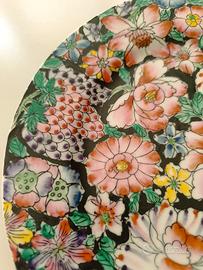 Piatto decorativo cinese vintage con decoro "millefiori" (o millefleurs), caratterizzato da un fitto motivo floreale policromo su fondo nero. Stile: Chinoiserie/Tradizionale cinese. Materiale: Porcellana. Decorazione: Motivo floreale densamente dipinto, spesso ispirato a porcellane della dinastia Qing. Periodo: databile tra il XIX e il XX secolo.