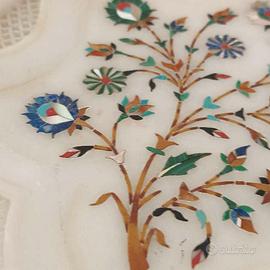 Piatto decorativo in marmo bianco scolpito e traforato. Al centro intarsio a
