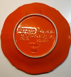 Colore arancione. Ceramica. sul davanti scritta Piatto del Castello baccalà alla vicentina Marostica VI. Sul retro scritta Antonio Bonotto Marostica VI e numero telefono