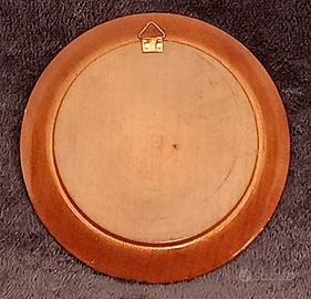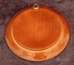 Piattino di legno anni ’60, souvenir di Davos / Svizzera con incisi gli stemmi dei cantoni e della bandiera svizzera. Dimensioni: diametro cm 12 x h1,5 / peso: 56g.