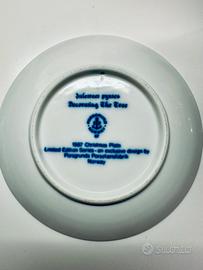 Design: Il piatto presenta un'illustrazione dettagliata in blu cobalto su sfondo bianco, raffigurante un gruppo di figure, presumibilmente bambini o angeli, in un'ambientazione festiva. Il design specifico varia ogni anno.