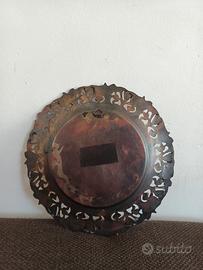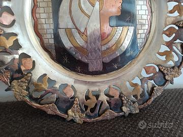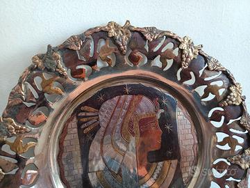 Vendo vecchio piatto Egiziano in metalli diversi ,intagliato e inciso, al centro figura di faraone e tutt' attorno grappoli d'uva e foglie, diametro cm 29, qualche segno del tempo non ne compromette la bellezza.