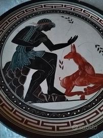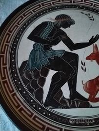 Piatto decorativo in ceramica ispirato alla ceramica greca antica, raffigurante una scena mitologica.
