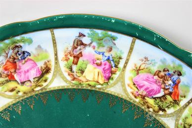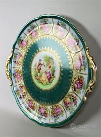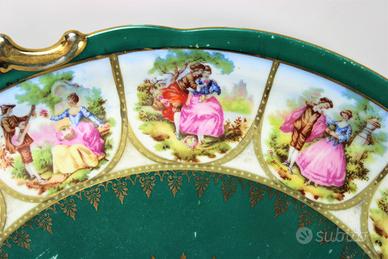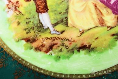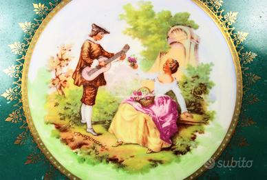 Bellissimo piatto in ceramica originale di inizio secolo '900 completamente decorato a mano, con figure in voga all'epoca, di scene galanti di corteggiamento tra dama e cavaliere.