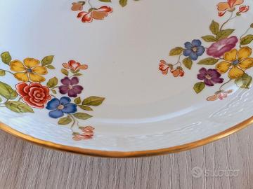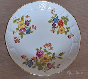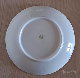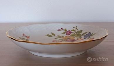 Piatto in porcellana Richard Ginori Italia. Decoro floreale, il bordo lavorato con motivo a rilievo e rifinito in oro zecchino. Diametro 19 cm, altezza 3,5 cm.