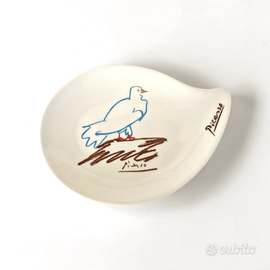 Questo oggetto fa parte della collezione ufficiale prodotta dall'italiana Tognana su licenza della Succession Picasso. A differenza dei piatti piani da portata, questo specifico pezzo è spesso identificato come "Porte-Savon" (Portasapone) o "Svuotatasche" per la sua caratteristica forma concava e rettangolare. Soggetto: Riproduce l'illustrazione "Juan Le Petit Pigeon Veuf" (Juan il piccolo piccione vedovo) del 1961. Il disegno raffigura un piccione stilizzato, parte di una serie di schizzi che Picasso dedicò a temi bucolici e domestici in quel periodo. Funzioni: Sebbene faccia parte di un set che include stoviglie, la sua conformazione lo rende ideale come accessorio da scrivania, da bagno o come piccolo vassoio decorativo. Caratteristiche Estetiche: Porcellana bianca di alta qualità con stampa serigrafica blu e nera. Reca la firma di Picasso sul fronte e i dati della licenza MMI (Museum Masters International) sul fondo.