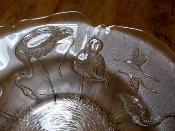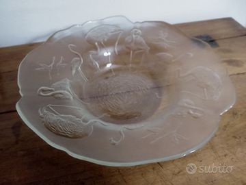 Splendido centrotavola in vetro di produzione francese con lavorazione a rilievo diametro cm 36 h cm 8