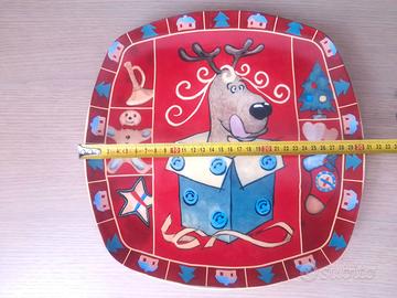 Vendo nuovo piatto in ceramica. Colore rosso con simpatici disegni natalizi. Forma quadrata, diametro 30cm.