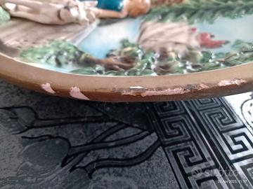 Altorilievo in gesso raffigurante signora con cani a passeggio. Risale agli anni '50 (come si evince dall'abbigliamento). Presenta parti un po' scrostate sul bordo evidenziate in foto. Diametro: 36,5 cm. Si appende al muro, ha un gancio posteriore.