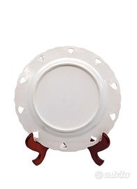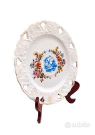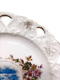 Antico piatto decorativo in porcella traforata stile Liberty, decorazioni policromi floreali che contornano un mulino blu al centro, oro su bordi traforati.