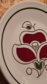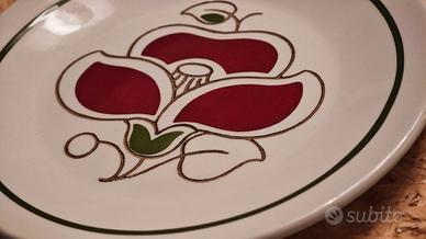 Piatto Richard Ginori 20cm, Manifattura di Laveno Designer: Antonia Campi. Periodo: Anni 1960 - 1970. Porcellana bianca con decoro floreale stilizzato nei toni del rosso e verde, bordato in verde. Condizioni ottime