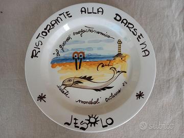 Piatto "del buon ricordo" del Ristorante Alla Darsena di Jesolo (VE), prodotto 40 anni fa per la manifestazione Estate Mondiali Ciclismo 1985, diametro cm.25, firmato ceramica Lion di Nove (Bassano del Grappa - VI), foro passante sul retro per appenderlo senza supporto. Condizioni perfette, no macchie e no sbeccature, vendo ad Euro 10. Spedizione in tutta Italia ad Euro 7 con pacco postale tracciabile Postedelivery, assicuro robusto imballo ultra imbottito.