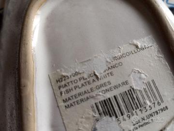 Piatto/Vassoio x pesce o molto altro in gres, come si vede da foto in bianco/panna con rigature e bordo in circa beige/marrone il tutto con puntini colorati, sono presenti un pois beige/marrone e una rilevatura di materiale tutto da origine, condizioni + che buone/quasi ottime, a 5€,. ho anche altri annunci,.