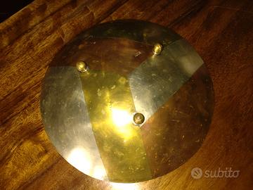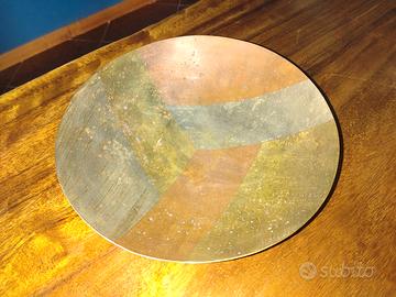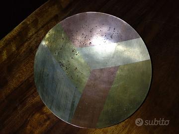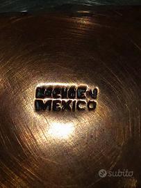 Ciotola artigianale in metallo misto (rame, ottone, alluminio) di Los Castillo Metales Casados. Prodotta in Messico negli anni '50, con tre piedini sferici saldati sul fondo. Punzonata sul retro e marchiata "Echo en Mexico". In ottime condizioni, con vari punti di ossidazione sul fronte (che possono essere trattati con apposite creme lucidanti) e molto più lucido sul retro. Per amatori e collezionisti. Misure di riferimento in foto. Le foto descrivono esattamente il piatto e sono parte integrante della descrizione. Visita il mio profilo per altri oggetti rari in metallo e non solo. Attendo offerte sensate.