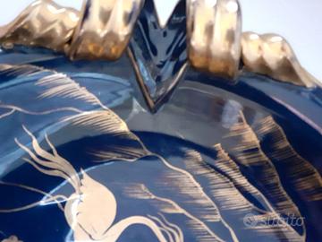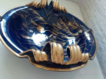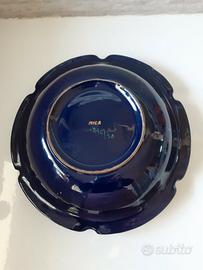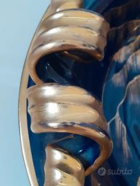 Grande piatto vintage M.I.C.A. manifattura italiana ceramiche d'arte , fatto e dipinto a mano, primissimi 900,blu cobalto e oro,dalla realizzazione complessa tipica del brand con manici attorcigliati, misure diametro 29 cm H 11 cm peso 1 kg. pezzo da collezione.