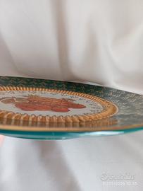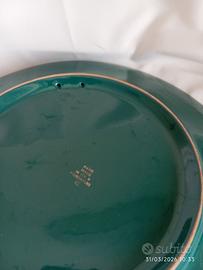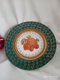 Elegante piatto decorativo in porcellana con una splendida stampa di frutta. - Bordo verde scuro con motivo dorato. - Dettagli dorati sul bordo interno in rilievo. - Raffigurazione di ananas e fragole al centro. - diametro cm 29. - Peso 1 kg. - Handemade Made in Italy Fiorentine. - Piatto da appoggio o da parete con due fori sul retro. #piatto #piattodecorativo #piattovintage #piattodaparete #piattodaappendere #piattoporcellana #piattodaappoggio #piattoarredamento #idearegalo