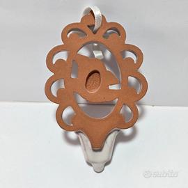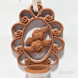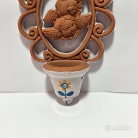 Piccola acquasantiera da collezione in terracotta e maiolica con putti, nel retro scritta Val Demone Sicilia.