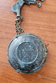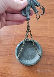 Piccola bilancia stadera, in metallo. È antica, vintage. Il piattino presenta dei fiori in rilievo nella parte interna. Purtroppo non so esattamente in che materiale è fatta. Peso= 93 grammi. Difetti= non è completa, è rotta, come visibile dalle foto.