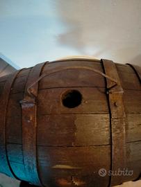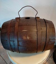 Piccola botte in legno in buone condizioni,con qualche segno d' uso sulla superficie come da foto. Altezza 26cm, diametro 16cm peso 1,37 kg