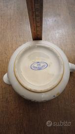 Piccola brocca in fine porcellana bianca con motivi floreali è una lattiera vintage, un elemento tipico dei set da tè o caffè. L'oggetto presenta un corpo arrotondato, un manico ad anello e un caratteristico beccuccio corto. La decorazione alla base raffigura un prato con piccoli fiori di campo colorati in tonalità pastello come rosso, giallo e azzurro, uno stile molto comune nelle porcellane prodotte negli anni '70 da marchi famosi per la qualità dei materiali e la raffinatezza dei decori.