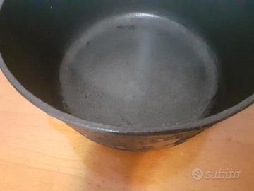 creuset cocotte interamente in ghisa (compresi i manici e il pomello del coperchio) da collezionare o da ripristinare (vedi foto 6); diametro 26cm, altezza (senza coperchio) 12cm, peso 4,4kg. Desquamata in alcuni punti.