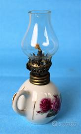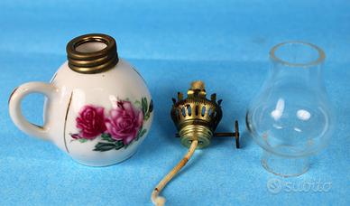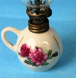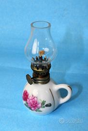 Graziosa lampada a petrolio completa di boccia in porcellana bianca, con decorazioni floreali e anello in ottone con porta stoppino regolabile.