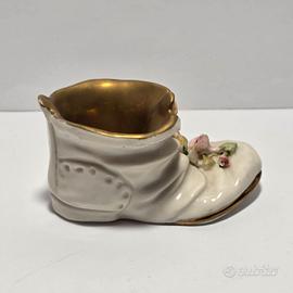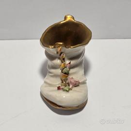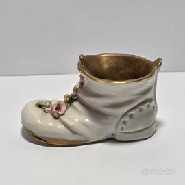 Piccola scarpa in miniatura in ceramica bianco oro e fiori.