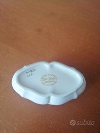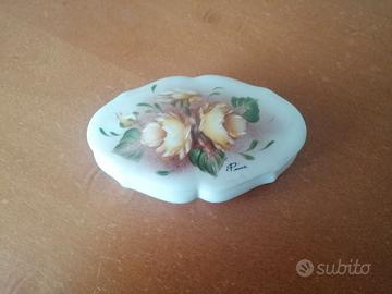 L'oggetto nell'immagine è una piccola scatola in porcellana, un portagioie o un cofanetto, dipinta a mano con un motivo floreale di rose gialle e foglie verdi.