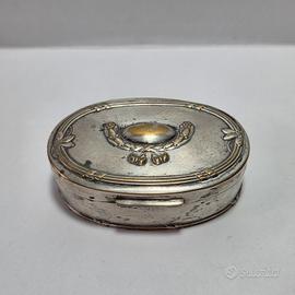 Piccola scatola ovale in metallo argentato lavorata con decori floreali. Fine 800.