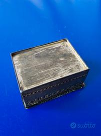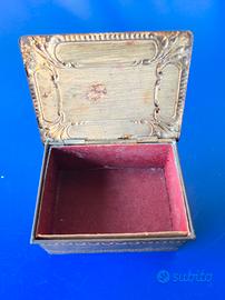 Come da titolo vendo elegante scatola vintage in metallo, perfetta per conservare piccoli oggetti. Design decorato con motivi classici. Materiale metallico resistente. Buone condizioni generali. Perfetta per collezionisti o arredamenti. Misure: altezza circa 6cm, larghezza circa 12cm, profondità circa 9cm.