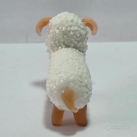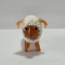 Scultura di piccola pecora in vetro bianca e arancione.