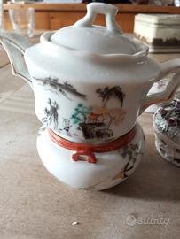 piccole porcellane due bomboniere con coperchio una rotonda e una ovale una zuccheriera con coperchio disegni cinesi e una teiera senza coperchio disegni cinesi