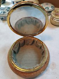 Scatolina in sughero, interno in tessuto con specchio e finiture in metallo leggero colore oro.