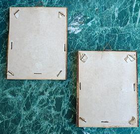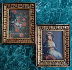 Questa coppia di piccoli quadri presenta riproduzioni di celebri opere d'arte classiche, incorniciate in eleganti cornici dorate e ornate.