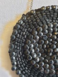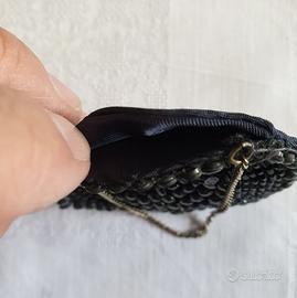 Piccolo portamonete rotondo, epoca primi 900, fatto a mano con micro perline in vetro colorato nero. In perfette condizioni, in tutto come da foto. Oggetto prezioso per collezionisti o amanti del Vintage.