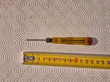 Piccolo cacciavite vintage con manico in plastica giallo trasparente.