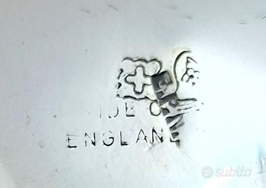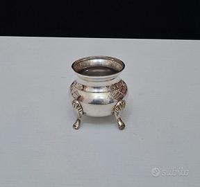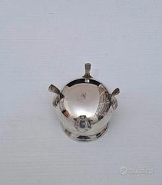 Vendo piccolo calderone vintage a quattro zampe e corpo bulboso. Altezza cm 5,8, diametro superiore cm 5,3. Può essere usato come zuccheriera, porta sale o bruciatore d'incenso. Il recipiente metallico è fatto di E.P.N.S (= electro plated nickel silver ovvero è fatto da una lega di metallo base rivestita da uno strato argentato) come da scritta nella parte inferiore. Nella parte inferiore oltre alla scritta E.P.N.S e made in England, compare lo scudo con la croce, marchio tipico della ditta Barker brothers fondata a Birmingham. l'oggetto risale indicativamente tra il 1940e il 1960 anni in cui l'azienda ha prodotto una vasta gamma di argenteria per uso domestico e decorativo inclusi piccoli calderoni o zuccheriere a pentolino. Segni del tempo visibili allargando le foto, è comunque da pulire