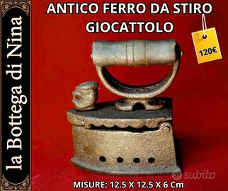 Rarissima miniatura di ferro da stiro a brace in ghisa con finiture in ottone ossidato. Dimensioni molto ridotte (circa 12,5 x 12,5 cm), tipiche dei ferri da sarto per cuciture di precisione o dei giocattoli d'epoca per bambine. Il coperchio si apre tramite cerniera originale funzionante, rivelando la camera interna dove veniva inserita la brace. Presenti i caratteristici fori di aerazione laterali. Manico ad arco con rivestimento isolante originale. ✅ Miniatura originale, non riproduzione moderna ✅ Dimensioni: ~12,5 x 12,5 cm ✅ Materiale: ghisa e ottone ✅ Epoca: fine '800 – inizio '900 ✅ Coperchio apribile funzionante ✅ Pezzo da collezione – raro in queste dimensioni Perfetto per collezionisti di giocattoli antichi, ferri da stiro d'epoca o oggetti da sarto storici.