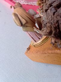 Piccolo presepe ,natività completa di Sacra famiglia, pastore , pecora ( resina)e ceppo d' albero su base di legno.