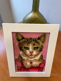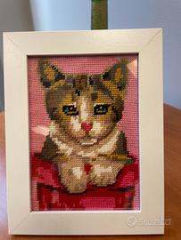 Piccolo quadro da appendere o da esporre su un mobile ,cornice bianca, lavorazione ricamo punto croce raffigurante un gattino multicolor.