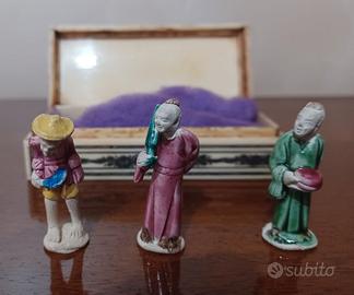 Piccolo scrigno intarsiato contenente tre piccole statuine in terracotta raffiguranti contadini orientali, sono delle piccole opere d arte, cortesemente solo Contatti via email o ws grazie