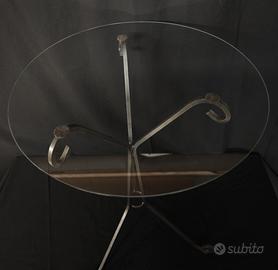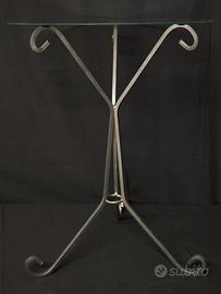 Tavolino di piccole dimensioni realizzato in ferro battuto con piano circolare in vetro trasparente.
