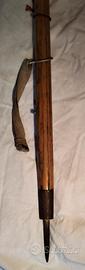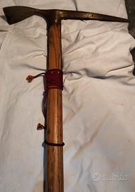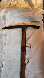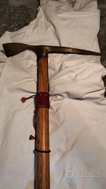 Composta da un manico in legno, una testa in metallo dotata di una lama da un lato e una paletta (o martello) dall'altro. Utilizzo storico: Veniva utilizzata per aiutare nella progressione su pendenze innevate o ghiacciate. Caratteristiche vintage: La presenza del manico in legno e dei lacci decorativi suggerisce un modello d'epoca, spesso conservato oggi come oggetto da collezione o decorativo. Misure 84x34. Ottime condizioni. Poco utilizzata.