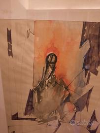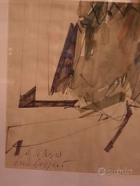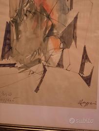 Bel quadro di Piero Ruggeri (Torino 1930 - Avigliana 2009). Il soggetto è tipico dei temi dei primi anni 70, in genere veniva intitolato "uomo" o "figura". Tecnica mista acquerello, biro e pennarello, su carta. Firmato in basso a dx e con dedica "A Silvia" in basso a sx, con altra firma