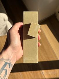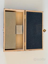 Bellissima belga Grosse Jaune di ardennes coticule completa di scatola in legno e bout. Misure generose, specifica per passaggio intermedio per rasoi a mano libera.