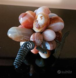 Pietra dura semipreziosa Agata Corniola levigata a Grappolo di uva con foglia color verde metallico, vintage anni '80.