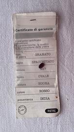 pietra granato naturale proveniente dall'India taglio sfaccettato, misura mm. 9x7 forma ovale, finitura buona, colore rosso, in confezione originale con certificato di garanzia. proveniente da collezione vendesi euro 8