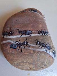 Pietra naturale, molto bella, levigata dal tempo, colore sfumato dal rosa al giallo ocra con venature di quarzo bianche. Su questa strada bianca ho immaginato e ho disegnato 14 formichine che girano intorno da tutti i lati. Da usare come soprammobile o fermacarte, si può apprezzare la sua bellrzza da tutti i lati. Nell'ultima foto potrai vedere com'era la pietra prima della pittura.