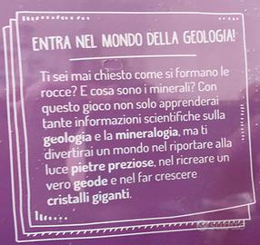 Il set (mai aperto) contiene un blocco di terreno da scavare, gli strumenti per estrarne i minerali, un grande geode da realizzare, le sostanze chimiche per creare grandi cristalli e un libretto che ti spiegherà tutto ciò che devi sapere sui minerali e le gemme.